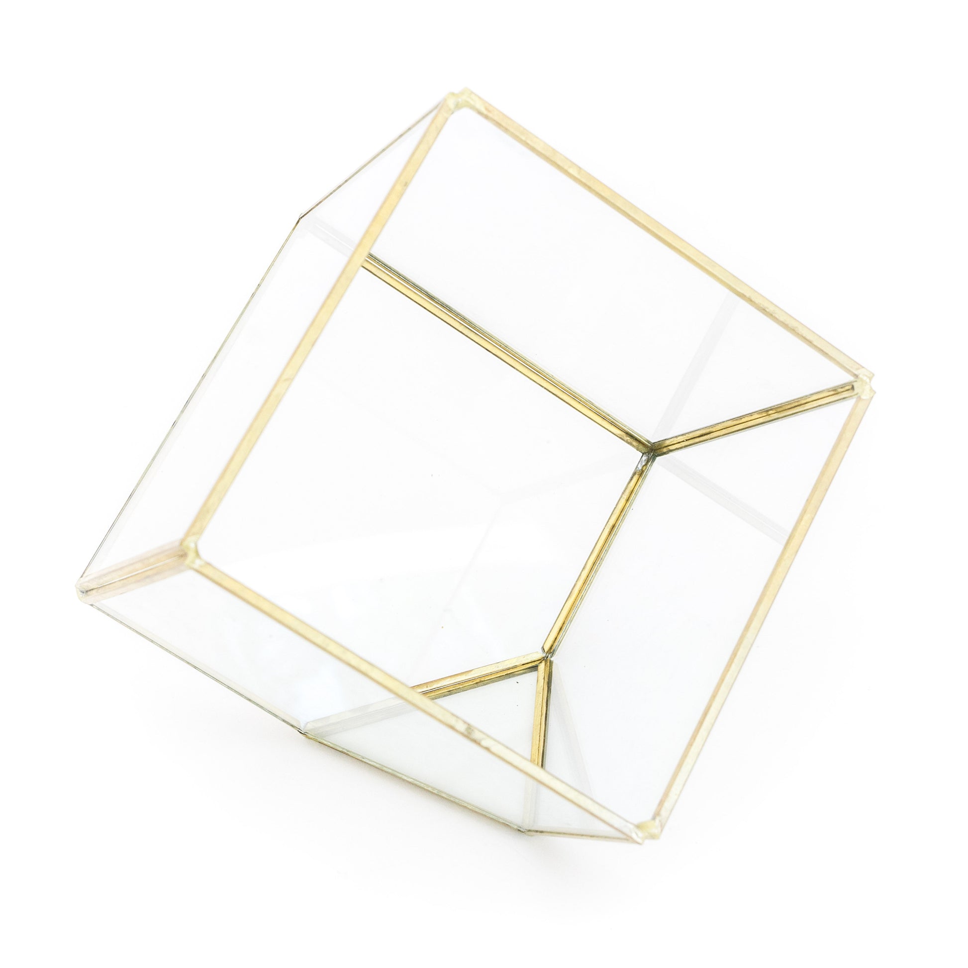 A seven-sided, gold-plated terrarium with a small Tillandsia Xerographica air plant. Sits beautifully on its triangular base for your home or workspace. Also makes a perfect gift!