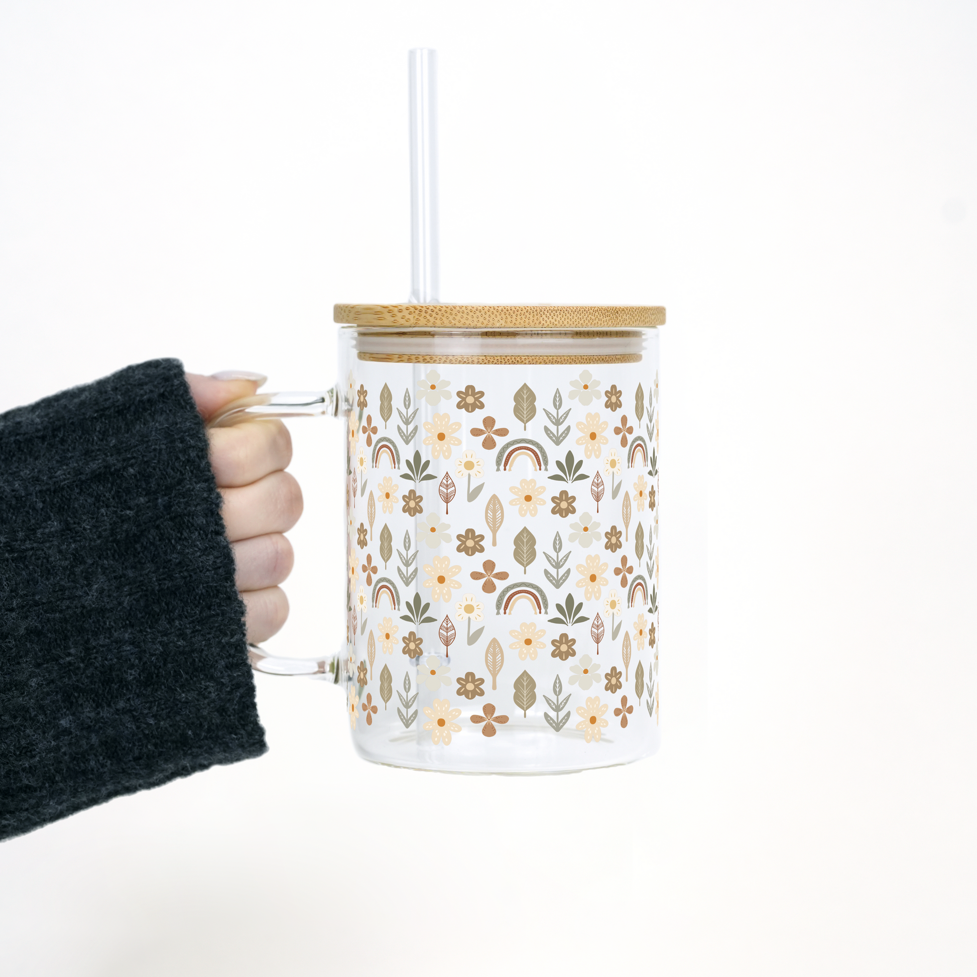 Neutral Wildflowers 17oz Glass Mug With Lid and Straw