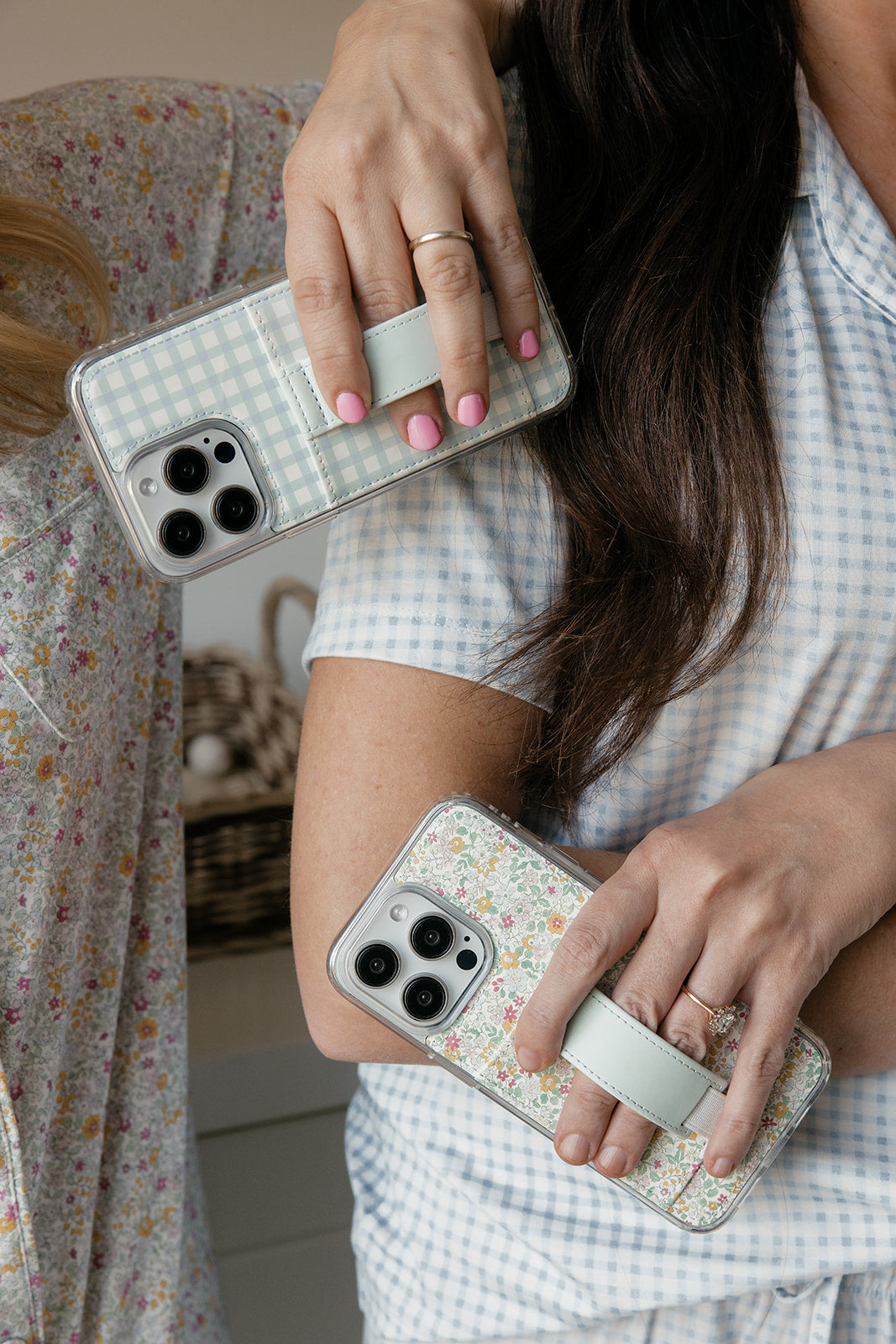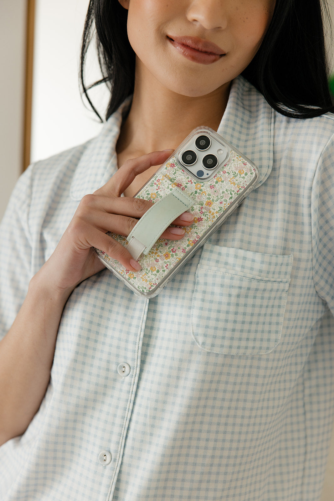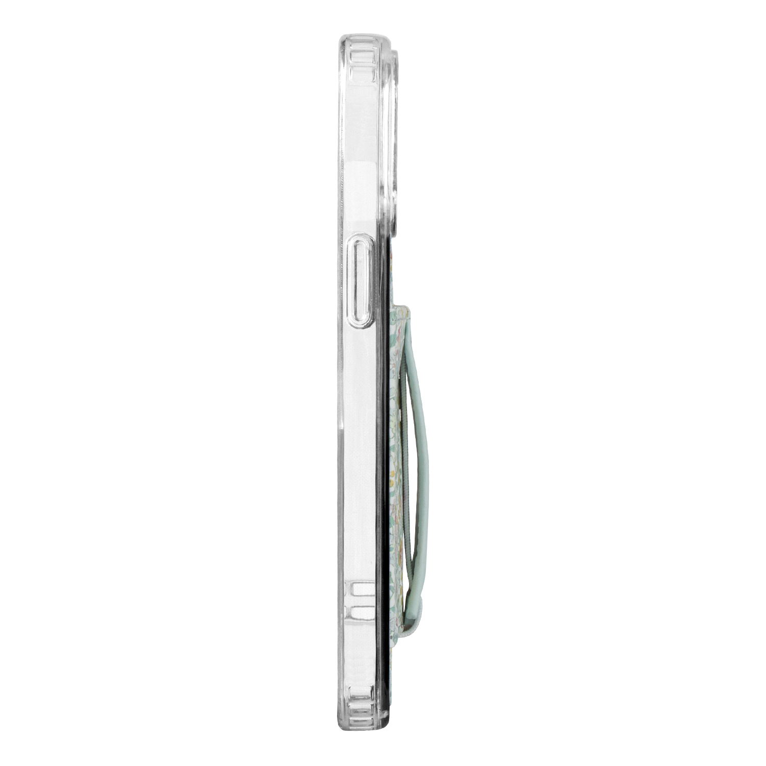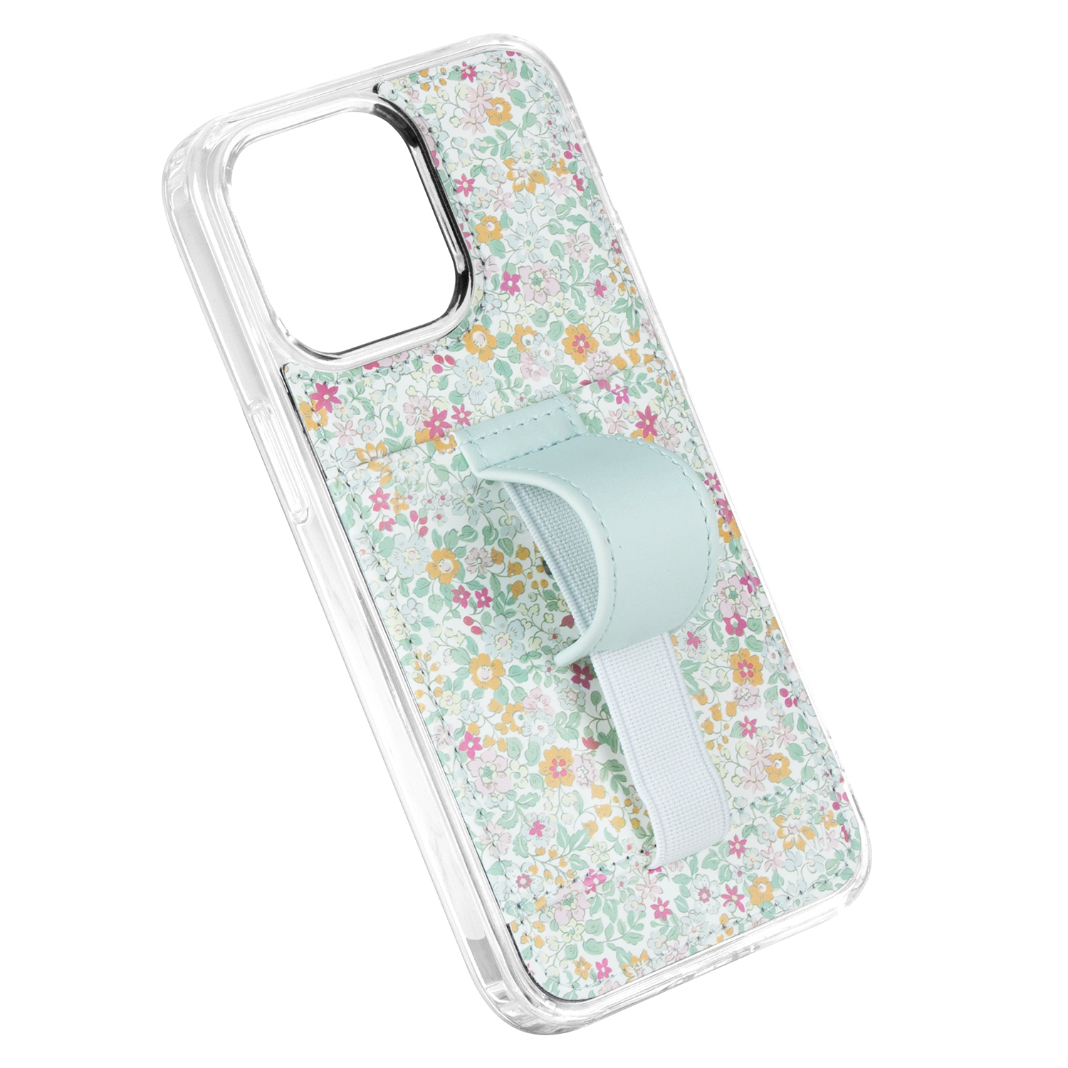Case Design: Pink, blue and yellow flowers with a solid blue strap