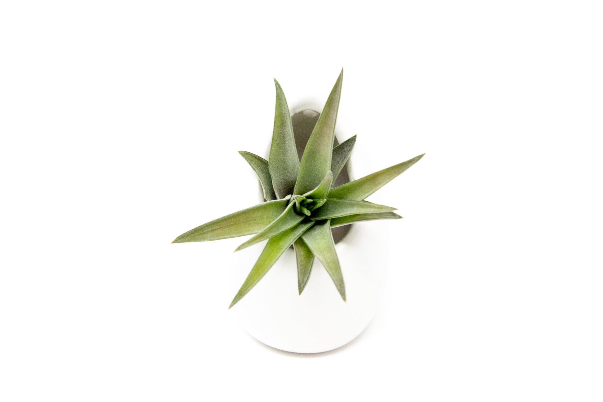 Our beautiful small ivory ceramic containers are modern, warm, and the perfect holder for many of our larger species of air plants. Our favorite plants to pair with the small ivory vase are Velutina and Baileyi. This ceramic vase can be hung and has a flat bottom for setting on tables, desks, etc.