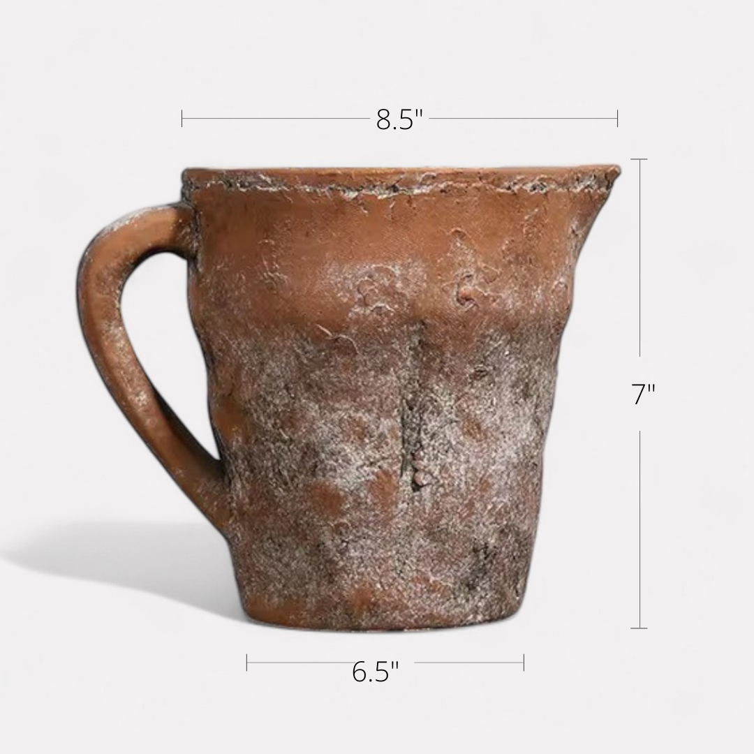 Elevate your space with the timeless charm of the Valencia Carafe-Style Cement Planter, Hand-Painted in Aged Terracotta, 8.5"D x 6.5"D x 7"H. Crafted from durable cement, this distinctive piece takes inspiration from the graceful curves of a classic pitcher, merging form and function in an exquisite design. Its sturdy construction ensures lasting strength, while its handcrafted artistry lends a unique, personal touch to every planter. Subtle mold lines, a hallmark of its artisanal creation, add character and authenticity, making each piece truly one of a kind.