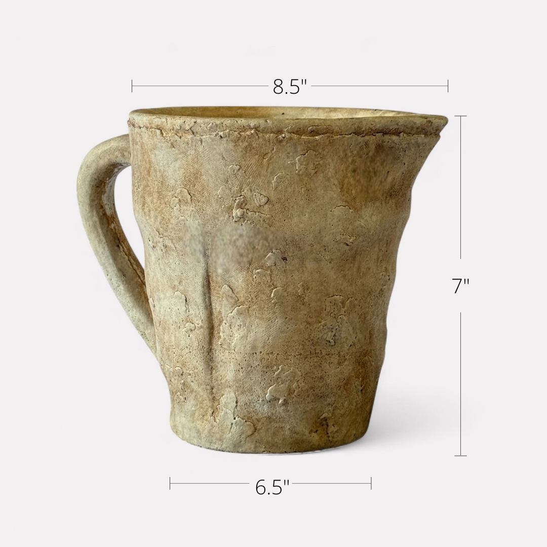 Elevate your space with the timeless charm of the Valencia Carafe-Style Cement Planter, Hand-Painted in Aged White, 8.5"D x 7"H. Crafted from durable cement, this distinctive piece takes inspiration from the graceful curves of a classic pitcher, merging form and function in an exquisite design. Its sturdy construction ensures lasting strength, while its handcrafted artistry lends a unique, personal touch to every planter. Subtle mold lines, a hallmark of its artisanal creation, add character and authenticity, making each piece truly one of a kind.