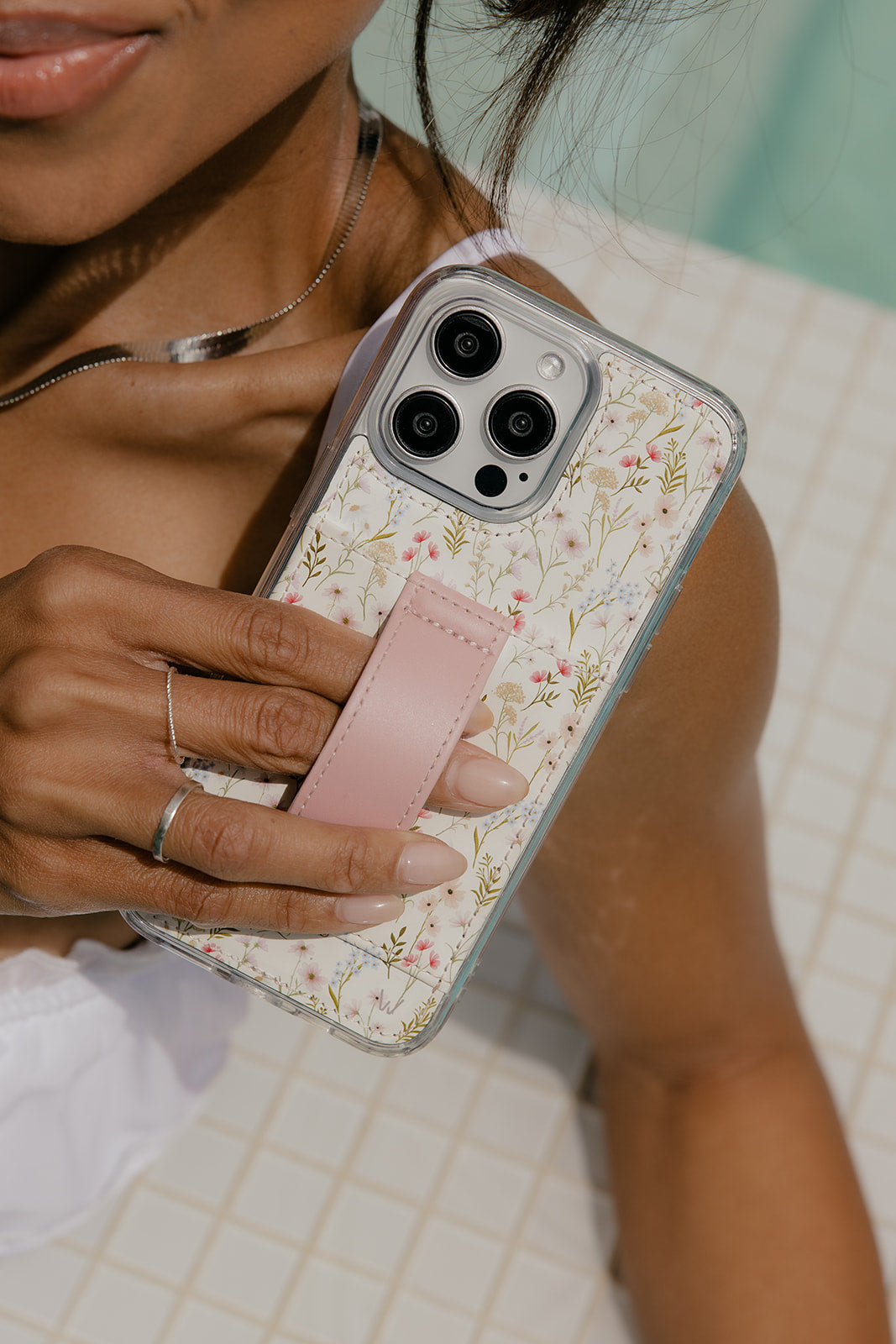 Case Design: Blue, white, pink, peach and mauve flowers with a solid mauve strap.
